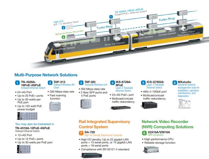 - Turbo Ring and Turbo Chain (recovery time < 20 ms @ 250 switches), and STP/RSTP/MSTP for network redundancy